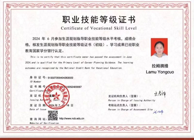 在南充文化旅游职业学院酒店管理系高速铁路客运服务专业的三年里,拉姆拥措用行动诠释了“技能立身”的真谛。课堂上,总是坐在第一排,笔记本上密密麻麻记录着老师讲解的每一个细节;实训室里,反复练习服务礼仪、票务操作等专业技能,直到每一个动作都标准到位。正是这种“精益求精”的态度,让她在学业上收获累累硕果:连续三年获得校一等奖学金、国家励志奖学金,考取四川省大学生综合A级证书,累计获得60余项荣誉称号。这些荣誉背后,是学校“五比、五赛”育人成果的生动体现。